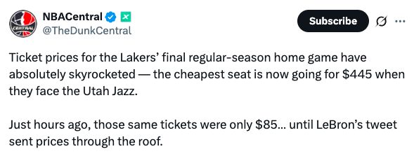 据票务网站显示,在詹姆斯发布推文之后,湖人常规赛最后一个主场比赛对阵爵士的门票价格已疯狂飙升,目前最低已高达445美元,就在几小时前,同等座位的票价仅为85美元。