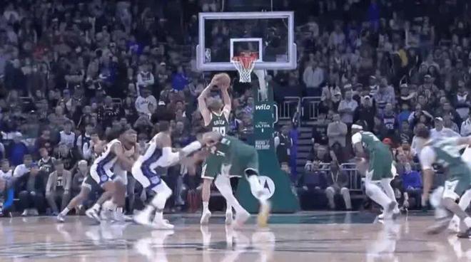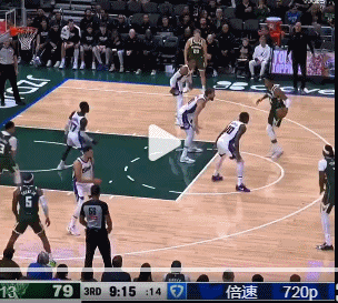 AJ-格林故意罚球不中,字母哥大鹏展翅抢到了前场篮板,奈何此时哨声响起,超时鸟……