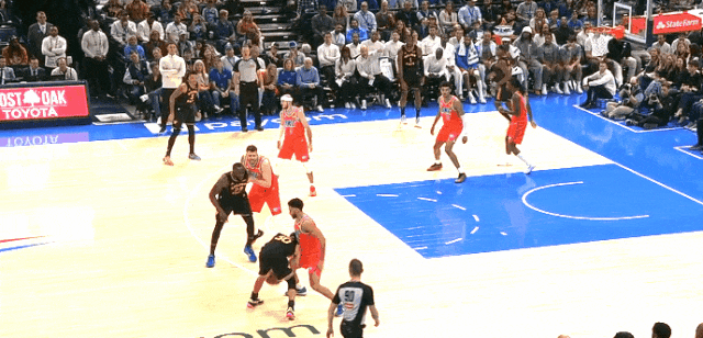 弱侧底角,库明加被放空,雷霆留一个人在禁区里。即,某个瞬间,雷霆四双眼睛看着库里。库里只能撤步强投——这球还亏理查抓到了前场篮板,但,依然。